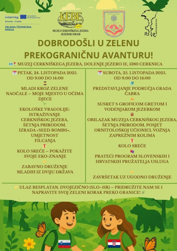 Za subotu 25.10.2025. godine, na istom mjestu organiziran je obiteljski dan ispunjen zabavnim i poučnim aktivnostima za sve članove obitelji – djecu i odrasle. Stoga vas sve pozivamo da nam se pridružite u subotu na adresi Dolenje jezero 1E, Cerknica.